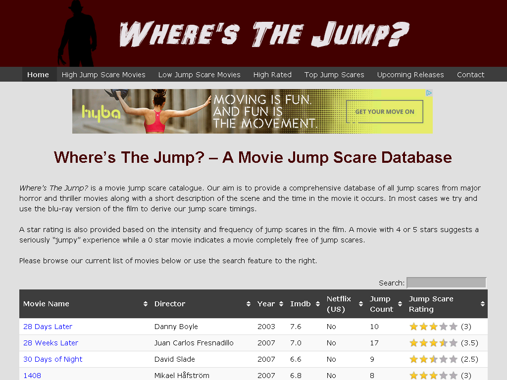 Do you absolutely love watching horror movies but hate jump scares? These are the moments in a movie when a dog suddenly barks, a cat jumps out from nowhere, a scary face pops up on screen, or a loud noise makes you "jump" from your seat. Where's The Jump is a searchable database of jump scares in horror movies so you can choose to avoid movies that contain excessive amounts of these moments. We also provide an overall jump scare rating for each movie based on how scary you will find the movie, as well as the times in a movie where each jump scare occurs so you can prepare yourself or even fast forward through these moments.