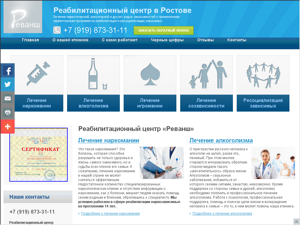 Rehabilitation center `Revenge` successfully works in the field of rehabilitation of persons with drug and alcohol addiction for 14 years. During these years, our experts have developed a comprehensive methodology, which includes the work of re-socialization dependent, as well as work with his loved ones and family members. This approach provides a stable positive result. Also, our center provides services for the treatment of gambling addiction and codependency. We have proved their professionalism, returning hundreds of people a happy life, without poison her bad habits. The center is located in Russia, in the city of Rostov- on-Don. Our experts will help you get rid of dependence, just contact us via the site or email message to the email