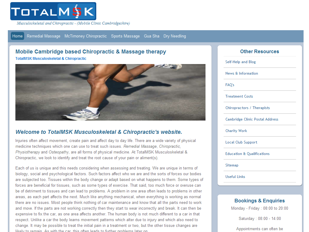 At TotalMSK Musculoskeletal and Chiropractic we specialise in the treatment of Musculoskeletal work and sports related conditions. Our aim is to identify the root cause of your pain and not just symptom. Treatment is then aimed at addressing the root cause and getting you out of pain and back to activity as quickly as is possible. The main Chiropractic technique used at the clinic in Cambridge (UK) is McTimoney Chiropractic, which is typically a full body treatment and very gentle. Most people associate cracking and popping noises with Chiropractic and Osteopathic treatment. The dominant form of Chiropractic in the world is diversified or High Velocity Low Amplitude (HVLA). McTimoney Chiropractic technique does not use HVLA, is very gentle and rarely produces any cracking or popping sounds. Terry the founder of TotalMSK Musculoskeletal and Chiropractic is also a highly qualified sports and remedial massage therapist and has also taught these subjects to students studying for massage qualifications. The combined knowledge and experience of McTimoney Chiropractic, sports massage and remedial massage techniques, has proved highly beneficial in terms of patient treatment and patient outcomes.