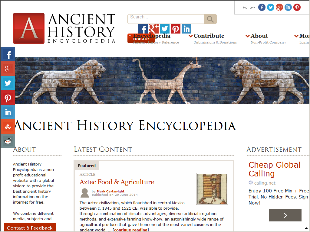 Ancient History Encyclopedia is a free source of reviewed and high-quality information about ancient history. The site was launched in 2009 with the goal of becoming the best free resource for ancient history, and it has succeeded: It is now the most-visited website solely dedicated to ancient history in the world (based on Alexa rankings in June 2014). The site was created by volunteers and depends on experts in their field contributing their knowledge to the site. Every single one of the over 2000 articles, images, maps, and timelines on this website are reviewed by an editorial team of teachers, historians, and authors (very different from a Wiki). The site is used by teachers and students worldwide.